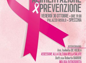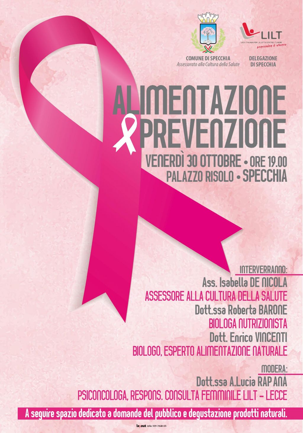 Un importante incontro a cura della LILT (Lega Italiana per la Lotta contro i Tumori) - Delegazione di Specchia, in collaborazione con l'Assessorato alla Cultura della Salute del Comune di Specchia. Venerdì 30 ottobre alle ore 19.00 la Sala Convegni di Palazzo Risolo, in Piazza del Popolo, a chiusura del mese dedicato alla prevenzione, si tinge di rosa e ospita il convegno “Alimentazione e prevenzione”.