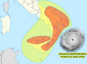 "VENTI SETTENTRIONALI DA FORTI A BURRASCA SU TUTTO IL TERRITORIO, CON RAFFICHE FINO A BURRASCA FORTE O LOCALE TEMPESTA SULLA PUGLIA MERIDIONALE, DOVE SARANNO POSSIIBILI INTENSE MAREGGIATE, SI PREVEDE IL PERSISTERE DI PRECIPITAZIONI, ANCHE A CARATTERE DI ROVESCIO O TEMPORALE, SU TUTTO IL TERRITORIO E IN PARTICOLARE SUL SETTORE IONICO. I FENOMENI SARANNO ACCOMPAGNATI DA ROVESCI DI FORTE INTENSITA', FREQUENTE ATTIVITA' ELETTRICA, POSSIBILI GRANDINATE E FORTI RAFFICHE DI VENTO".