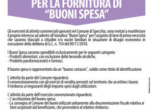Gli esercenti di attività commerciali operanti nel Comune di Specchia, sono invitati a manifestare il proprio interesse ad aderire all’iniziativa “Buoni Spesa” per l’acquisto di beni di prima necessità che saranno rilasciati a cittadini e/o nuclei familiari in situazione di disagio economico in esecuzione della delibera di G.C. n. 154 del 09/11/2018.