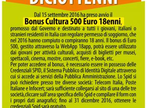 PROMOSSO DAL GOVERNO E DESTINATO A TUTTI I GIOVANI, ITALIANI O STRANIERI RESIDENTI IN ITALIA CON REGOLARE PERMESSO DI SOGGIORNO CHE NEL 2016 HANNO COMPIUTO O COMPIRANNO 18 ANNI. IL BONUS DI EURO 500 GESTITO ATTRAVERSO LA WEBAPP 18APP POTRA' ESSERE UTILIZZATO DAI GIOVANI PER ATTIVITA' CULTURALI, ACQUISTI DI BIGLIETTI PER MUSEI, SPETTACOLI, CINEMA, MOSTRE, CONCERTI, FIERE, ETC...