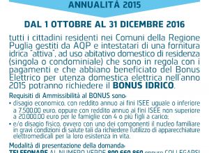 tutti i cittadini residenti nei Comuni della Regione Puglia gestiti da AQP e intestatari di una fornitura idrica “attiva”, ad uso abitativo domestico di residenza (singola o condominiale) che sono in regola con i pagamenti e che abbiano beneficiato del Bonus Elettrico per utenza domestica elettrica nell’anno 2015 potranno richiedere il BONUS IDRICO.