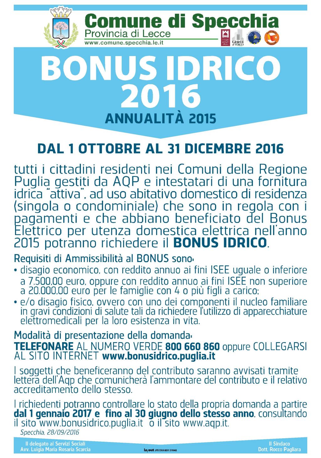 BONUS IDRICO PUGLIA 2016 - ANNUALITA' 2015 DOMANDE DAL 01 OTTOBRE AL 31 DICEMBRE 2016