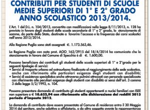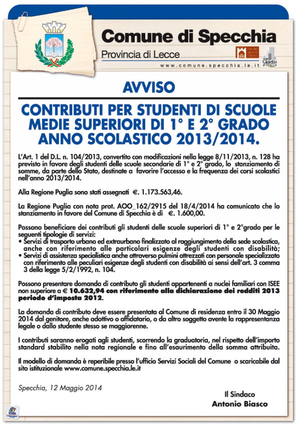 CONCESSIONE CONTRIBUTI PER STUDENTI DI SCUOLE MEDIE SUPERIORI DI 1° E 2° GRADO PER L'ANNO SCOLASTICO 2013/2014