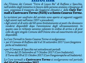 Sono aperte le iscrizioni per usufruire dei servizi che si svolgeranno a Santa Cesarea Terme e a Castrocaro Terme. Per chiarimenti e informazioni gli interessati possono rivolgersi agli Uffici dei...