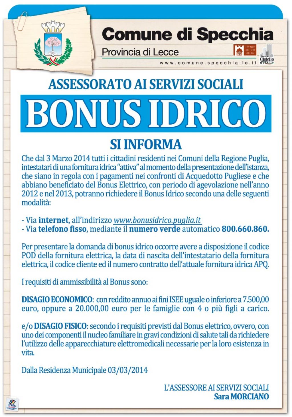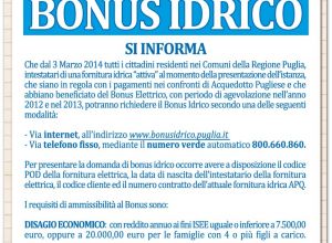 Tutti i cittadini residenti nei comuni della Regione Puglia, che siano intestatari di un'utenza idrica, potranno richiedere dal 3 Marzo 2014 il bonus idrico secondo una delle seguenti modalità: -...