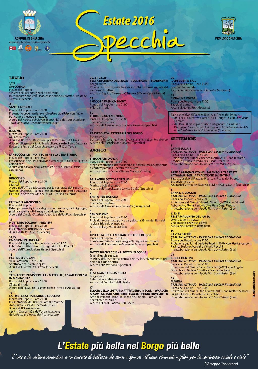 ESTATE SPECCHIESE 2016 - "L'estate più bella nel Borgo più bello" - PROGRAMMA DEGLI EVENTI
