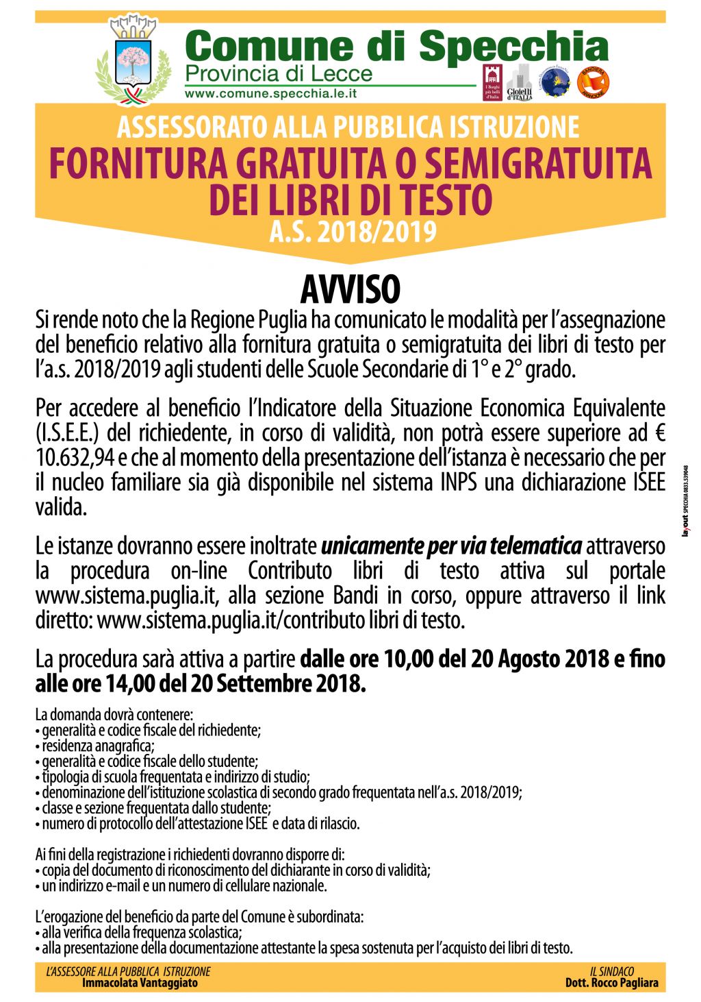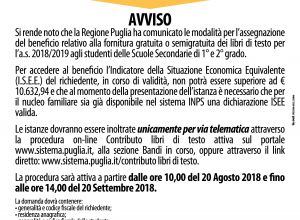 In riferimento al contributo per la fornitura dei Libri di testo delle scuole secondarie di I e II grado per l'a.s. 2018/2019 la Regione Puglia ha emanato l'Avviso pubblico per l'individuazione dei beneficiari valido sull'intero territorio regionale.