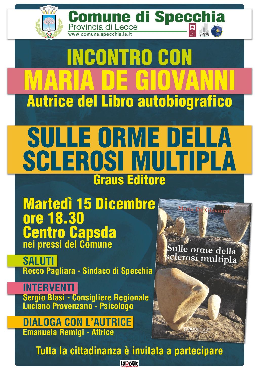 Arriva a Specchia Maria De Giovanni per presentare il suo libro autobiografico Sulle orme della sclerosi multipla edito da Graus.