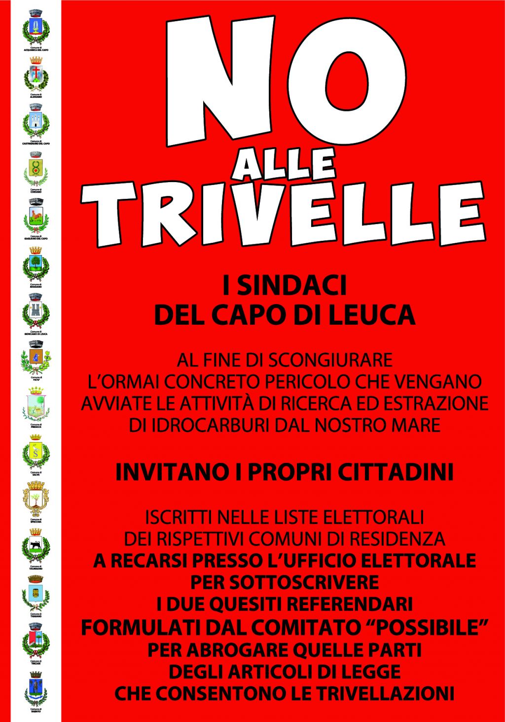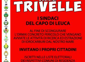 NO ALLE TRIVELLE - I SINDACI DEL CAPO DI LEUCA INVITANO I PROPRI CITTADINI A SOTTOSCRIVERE I DUE QUESITI REFERENDARI PER ABROGARE LE PARTI DEGLI ARTICOLI DI LEGGE CHE CONSENTONO LE TRIVELLAZIONI