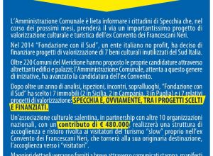 L'Amministrazione comunale è lieta di informare i cittadini di Specchia, che nei prossimi mesi, prenderà il via un importantissimo progetto di valorizzazione culturale e turistica del Convento dei Francesca Neri.