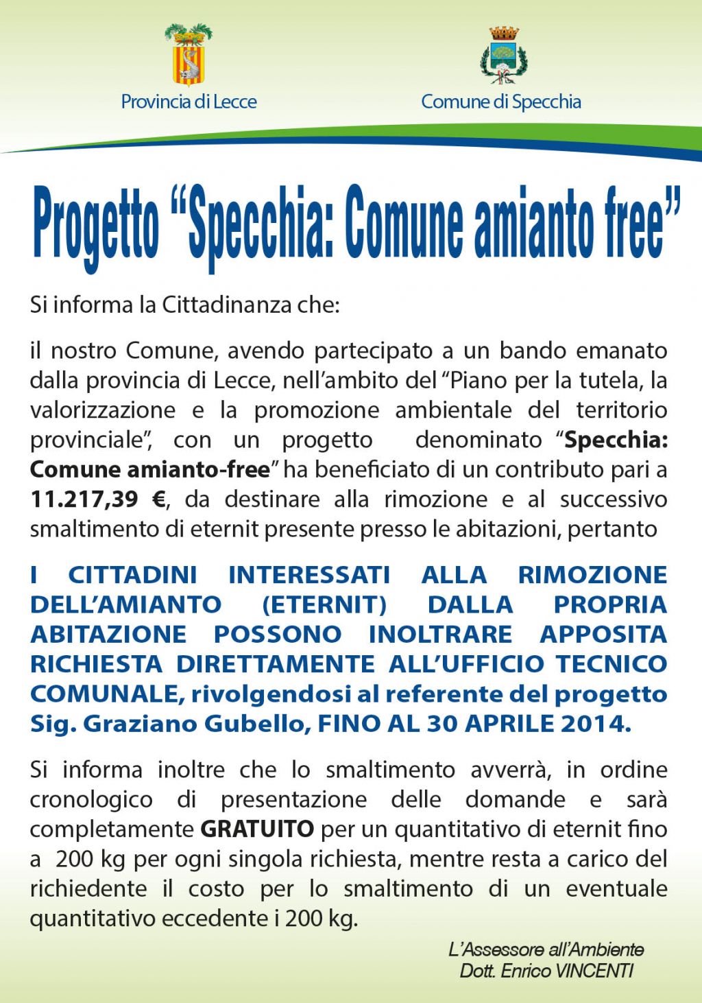 PROGETTO "SPECCHIA: COMUNE AMIANTO FREE"